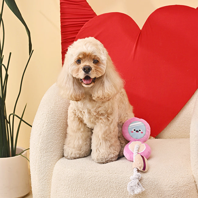 Who says makeup is only for humans? This cushion foundation dog toy turns a beauty favorite into a fun game. Two plush pieces connected by a rope make it great for tug-of-war or fetch, and the squeaker inside keeps dogs engaged.